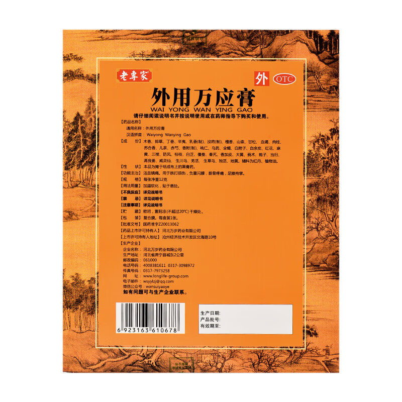 【注意事项】1.本品为外用药。2.切勿接触眼睛、口腔等黏膜处,使用后即洗手。3.忌食生冷、油腻食物。4.糖尿病严重者慎用,以防止使用不当引起皮肤损伤。5.运动员慎用,且应在医师指导下使用。6.经期及哺乳期妇女慎用,年老体弱者应在医师指导下使用老专家外用万应膏。7.本品含白附子、生川乌、生草乌,不宜长期或大面积使用。自行用药宜在7天以内,如用药超过7天,应向医师咨询。8.用药后局部皮肤如出现瘙痒、刺痛、皮疹时,应停止使用,症状严重者应及时就医。如出现皮肤以外的全身不适,应立即停用,严重者应及时就医。9.若出现局部红肿、疼痛、活动受限等不适症状加重者应去医院就诊。10.用药3天症状无缓解,应去医院就诊。11.对本品过敏者禁用,过敏体质者慎用。12.老专家外用万应膏性状发生改变时禁止使用。13.请将本品放在儿童不能接触的地方。14.如正在使用其他药品,使用本品前请咨询医师或药师。