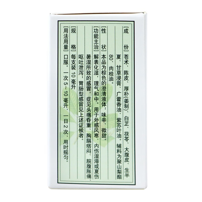 【主要成份】苍术、陈皮、厚朴(姜制)、白芷、茯苓、大腹皮、生半夏、甘草浸膏、广藿香油、紫苏叶油、干姜。
