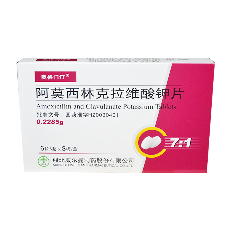 【用法用量】 口服,用量如下: 成人及体重大于40kg(或年龄大于12岁)的儿童,根据病情的需要,每次2-4片(每片含阿莫西林200mg和克拉维酸28.5mg),每12小时一次。或遵医嘱。 体重小于40kg(或年龄小于12岁)的儿童,建议选用混悬剂。如果选用本品,建议的剂量如下: 1)对于7-12岁的儿童,每次1片半(每片含阿莫西林200mg和克拉维酸28.5mg),每12小时一次。或遵医嘱。 2) 对于2-7岁的儿童,每次1片(每片含阿莫西林200mg和克拉维酸28.5mg),每12小时一次。或遵医嘱。 3) 对于9个月-2岁的儿童,每次1/2片(每片含阿莫西林200mg和克拉维酸28.5mg),每12小时一次。或遵医嘱。 对于肾功能受损患者:肾功能受损的病人一般不要求减少剂量;严重肾功能受损的病人,肌酐清除率<30ml/min者,不应服用本品。 对于肝功能受损患者:应慎用本品,并且应定期检查肝功能。
