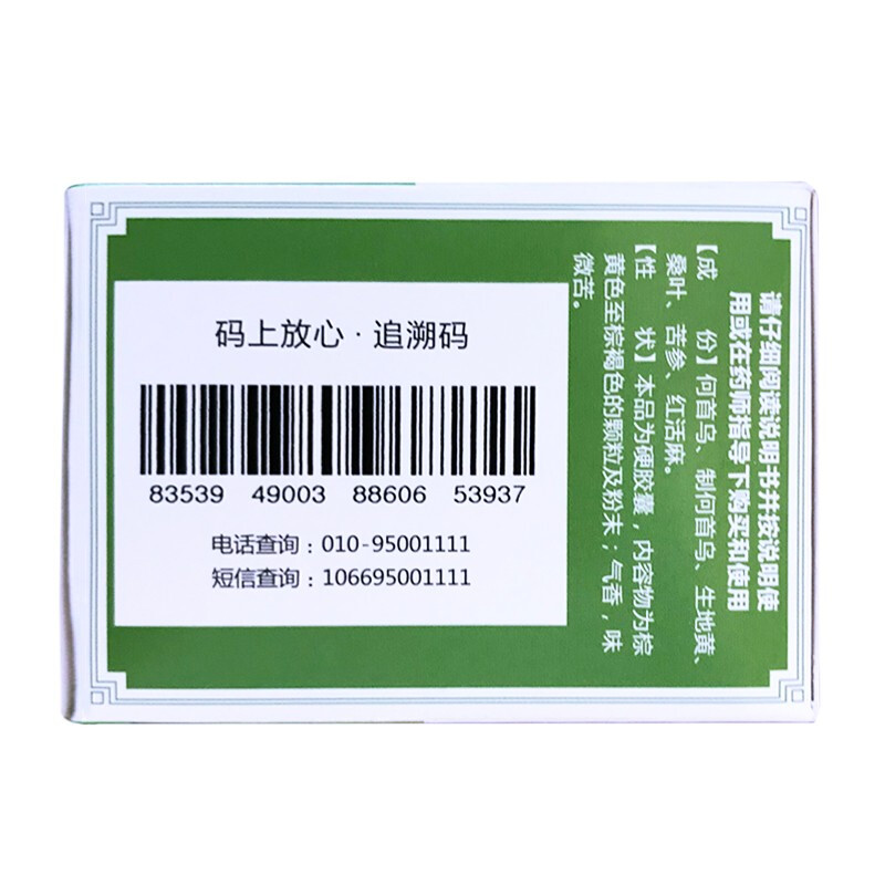 【主要成份】 何首乌、制何首乌、生地黄、桑叶、苦参、红活麻。
