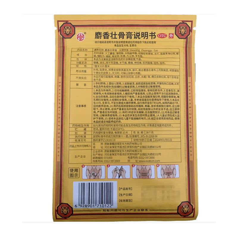 【注意事项】1.本品为外用药。2.切勿接触眼睛、口腔等黏膜处,使用后即洗手。3.忌食生冷、油腻食物。 4.有皮肤病者慎用。5.糖尿病严重者慎用,以防止使用不当引起皮肤损伤。6.运动员慎用,且应在医师指导下使用。7.麝香壮骨膏含盐酸苯海拉明、硫酸软骨素。哺乳期妇女慎用。8.经期妇女慎用。儿童、年老体弱者应在医师指导下使用。9.本品含生川乌、生草乌,不宜长期或大面积使用。自行用药宜在7天以内,如用药超过7天,应向医师咨询。10.用药后局部皮肤如出现瘙痒、刺痛、皮疹或皮肤红痒时,应立即取下,停止使用,症状严重者应及时就医。如出现皮肤以外的全身不适,应立即停用,严重者应及时就医。11.用药3天症状无缓解,应去医院就诊。12.对本品过敏者禁用,过敏体质者慎用。13.本品性状发生改变时禁止使用。14.儿童必须在成人监护下使用。15.请将本品放在儿童不能接触的地方。16.如正在使用其他药品,使用本品前请咨询医师或药师。
