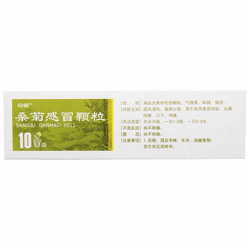 【注意事项】1.忌烟、酒及辛辣、生冷、油腻食物。2.不宜在服桑菊感冒颗粒期间同时服用滋补性中成药。3.风寒感冒者不适用,其表现为恶寒重,发热轻,无汗,鼻塞流清涕,口不渴,咳吐稀白痰。4.糖尿病患者及有高血压、心脏病、肝病、肾病等慢性病严重者、孕妇或正在接受其它治疗的患者,均应在医师指导下服用。5.服药三天后,症状无改善,或出现发热咳嗽加重,并有其他症状如胸闷、心悸等时应去医院就诊。6.按照用法用量服用,小儿、年老体虚者应在医师指导下服用。7.连续服用应向医师咨询。8.对本品过敏者禁用,过敏体质者慎用。9.本品性状发生改变时禁止使用。10.儿童必须在成人监护下使用。11.请将本品放在儿童不能接触的地方。12.如正在使用其他药品,使用本品前请咨询医师或药师。