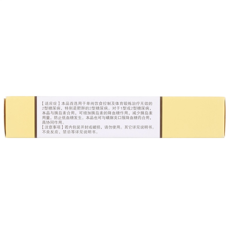 【适应症/功能主治】 1.本品首选用于单纯饮食控制及体育锻炼治疗无效的2 型糖尿病,特别是肥胖的2型糖尿病。 2.对于1型A2型糖尿病,本品与胰岛素合用,可增加胰岛素的降血糖作用,减少胰岛素用量,防止低血糖发生。 3.本品也可与磺酰脲类口服降血糖药合用,具协同作用。