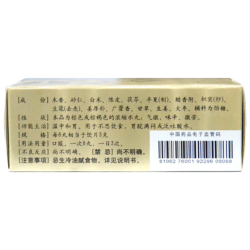 【主要成份】 白术、陈皮、茯苓、半夏(制)、香附(醋制)、枳实(炒)、豆蔻(去壳)、厚朴(姜制)、广藿香、甘草、木香、砂仁。辅料为:饴糖。