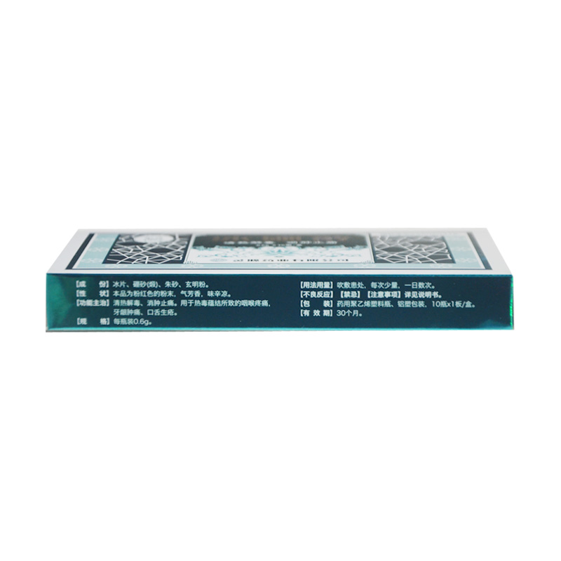 【主要成份】冰片、硼砂(煅)、玄明粉、朱砂。