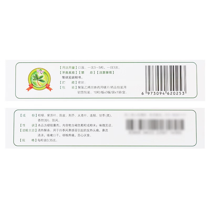 【主要成份】 桔梗、紫苏叶、陈皮、荆芥、大青叶、连翘、甘草(炙)、香附(炒)、防风。