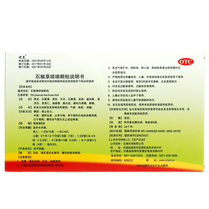 【性状】优克石椒草咳喘颗粒为浅棕色至棕褐色的颗粒;气香、味甜、微酸。