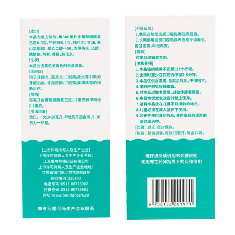 【主要成份】本品为复方制剂,每500毫升含葡萄糖酸氯己定0.6克、甲硝唑0.1克。辅料为:甘油、聚山梨酯80、聚乙二醇-400、浓薄荷水、乙醇、糖精钠、色素、香精、纯化水。