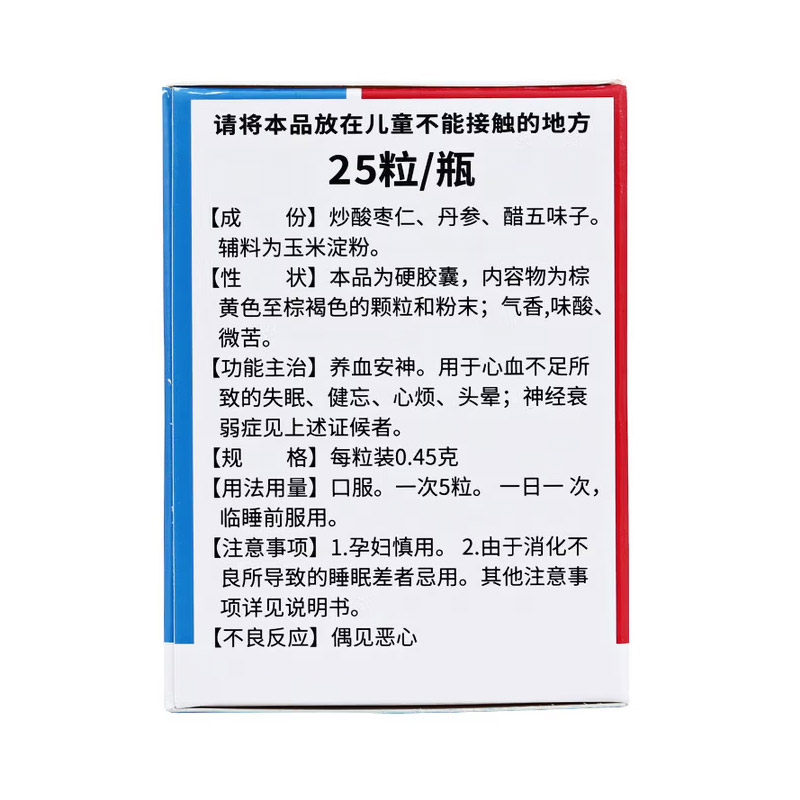 【主要成份】炒酸枣仁、丹参、醋五味子。辅料为玉米淀粉。