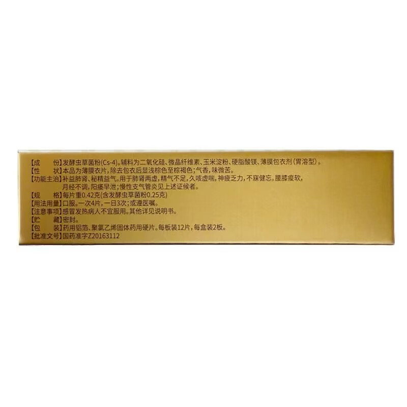 【主要成份】发酵虫草菌粉(Cs-4)。辅料为二氧化硅、微晶纤维素、明胶、硬脂酸镁、薄膜包衣剂(胃溶型)。每片重0.42g(含发酵虫草菌粉0.25g)。