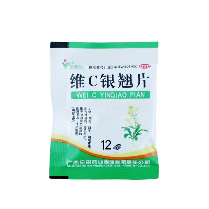 【注意事项】1.忌烟、酒及辛辣、生冷、油腻食物。2.不宜在服日田药业维C银翘片期间同时服用滋补性中成药。3.不适用于风寒感冒,表现为恶寒明显,无汗,头痛身酸,鼻塞流清涕。4.本品含马来酸氯苯那敏、对乙酰氨基酚、维生素C。服用本品期间不得饮酒或含有酒精的饮料;不能同时服用与本品成份相似的其他抗感冒药;肝、肾功能不全者慎用;膀胱颈梗阻、甲状腺功能亢进、青光眼、高血压和前列腺肥大者慎用;孕妇及哺乳期妇女慎用;服药期间不得驾驶机、车、船、从事高空作业、机械作业及操作精密仪器。5.心脏病、糖尿病等慢性病严重者应在医师指导下服用。6.儿童、年老体弱者应在医师指导下服用。7.服药3天后症状无改善,或症状加重,或出现新的严重症状如胸闷、心悸等应立即停药,并去医院就诊。8.对本品过敏者禁用,过敏体质者慎用。9.本品性状发生改变时禁止使用。10.儿童必须在成人监护下使用。11.请将本品放在儿童不能接触的地方。12.如正在使用其他药品,使用日田药业维C银翘片前请咨询医师或药师。