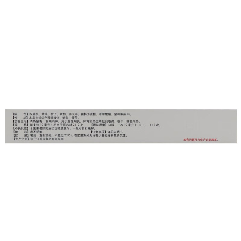 【注意事项】1.忌烟酒、辛辣、鱼腥食物。2.不宜在服扬子江蓝芩口服液期间同时服用温补性中药。3.孕妇慎用。糖尿病患者、儿童应在医师指导下服用。4.脾虚大便溏者慎用。5.属风寒感冒咽痛者,症见恶寒发热、无汗、鼻流清涕者慎用。6.服药3天症状无缓解,应去医院就诊。7.对本品过敏者禁用,过敏体质者慎用。8.本品性状发生改变时禁止使用。9.儿童必须在成人监护下使用。10.请将本品放在儿童不能接触的地方。11.如正在使用其他药品,使用扬子江蓝芩口服液前请咨询医师或药师。