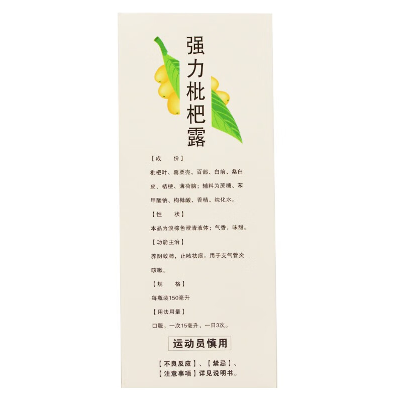 【注意事项】1.忌烟、酒及辛辣、生冷、油腻食物。2.不宜在服强力枇杷露期间同时服用滋补性中药。3.有支气管扩张、肺脓疡、肺心病、肺结核患者出现咳嗽时应去医院就诊。4.本品不宜长期服用,服药3天症状无缓解,应去医院就诊。5.严格按用法用量服用,年老体弱者应在医师指导下服用。6.对本品过敏者禁用,过敏体质者慎用。7.本品性状发生改变时禁止使用。8.请将本品放在儿童不能接触的地方。9.如正在使用其他药品,使用强力枇杷露前请咨询医师或药师。