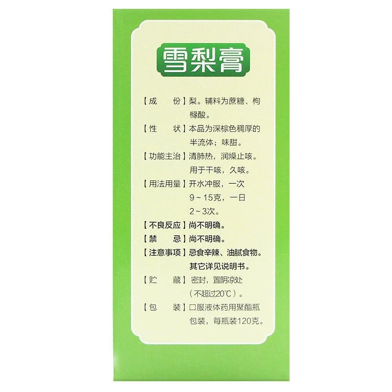 【注意事项】1.忌食辛辣、油腻食物。2.雪梨膏适用于肺燥咳嗽,其表现为干咳,咽喉疼痛,鼻唇干燥,痰少而质粘,不易咯出。3.支气管扩张、肺脓疡、肺心病、肺结核、糖尿病患者应在医师指导下服用。4.服用一周病证无改善,应停止服用,去医院就诊。5.服药期间,若患者出现高热,体温超过38℃,或出现喘促气急者,或咳嗽加重,痰量明显增多,痰由白变黄者应到医院就诊。6.对本品过敏者禁用,过敏体质者慎用。7.药品性状发生改变时禁止服用。8.儿童必须在成人监护下使用。9.请将此药品放在儿童不能接触的地方。10.如正在服用其他药品,使用本品前请咨询医师或药师。