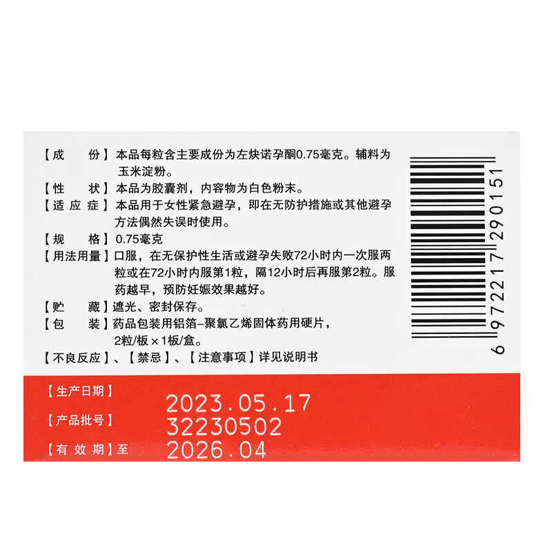 【用法用量】口服,在无保护性生活或避孕失败72小时内一次服两粒或在72小时内服第1粒,隔12小时后再服第2粒。服药越早,预防妊娠效果越好。